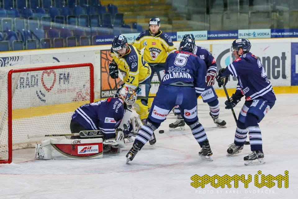 Poslední vzájemné utkání mezi Ústím a Benátkami toho divákům příliš nenabídlo. První příležitost otevřít skóre utkání měli hráči Slovanu. Zdeněk Doležal ale nakonec vyzrát z přečíslení na Tomáše Halásze nedokázal. Následně se v šanci ocitl bývalý hráč prostějovské letky, který nyní obléká dres Ústí, Patrik Moskal. Jeho střelecký pokus při přesilové hře minul odkrytou branku. Na druhé straně pokoušeli štěstí Jan Víšek a Jan Černoch, ale i jejich pokusy byly neúspěšné. Ve druhé části utkání mohl poslat Ústí do vedení Martin Vágner, místo kotouče však skončil v bráně pouze on sám. Štěstí neměl ani jeho týmový kolega Jan Dalecký, jehož střelu zabrzdila výstroj Halásze. Třetí třetina rovněž žádný gól nepřinesla.
